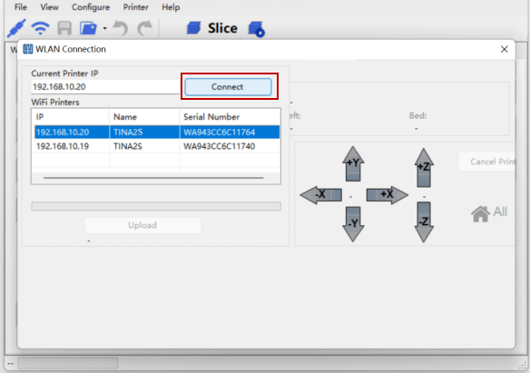Click "WLAN Connection", the software will automatically search for the 3D printers in the local network and show them in the below list. If no 3D printer be found, you can also try to manually enter the IP address of the 3D printer to connect.